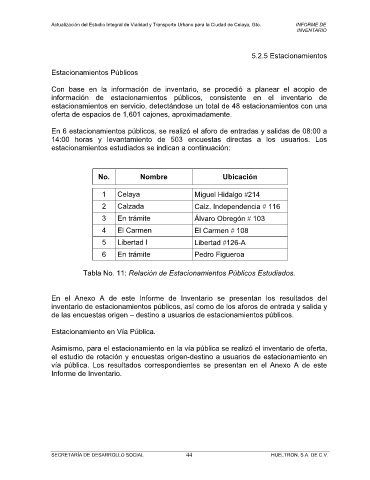 Tabla No. 11: Relación de Estacionamientos Públicos Estudiados.