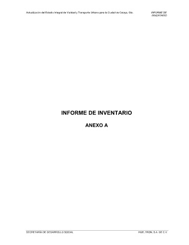 Actualización del Estudio Integral de Vialidad y Transporte Urbano para la Ciudad de Celaya, Gto. INFORME DE INVENTARIO INFORME DE INVENTARIO ANEXO A SECRETARÍA DE DESARROLLO SOCIAL HUELTRON, S.A. DE C.V.
