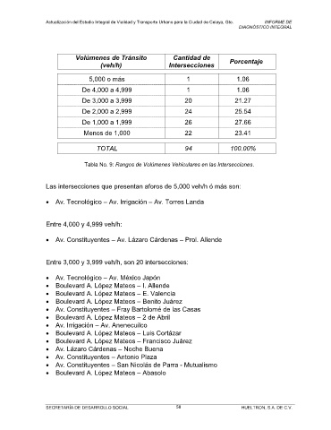 Tabla No. 9: Rangos de Volúmenes Vehiculares en las Intersecciones.