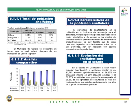 Índice de Total de población analfabeta por municipio 2000 analfabetismo 8.14% 11.5% 11.98% Fuente: SEG, Dir. Evaluación, con datos del XII Censo Nacional de Población y El Municipio de Celaya se encuentra en tercer lugar a nivel estatal, después de los municipios de León e Irapuato. 6.1.1.2 Análisis comparativo 1980 1970 1960 82.4 71.5 59.5 17.6 28.5 40.5