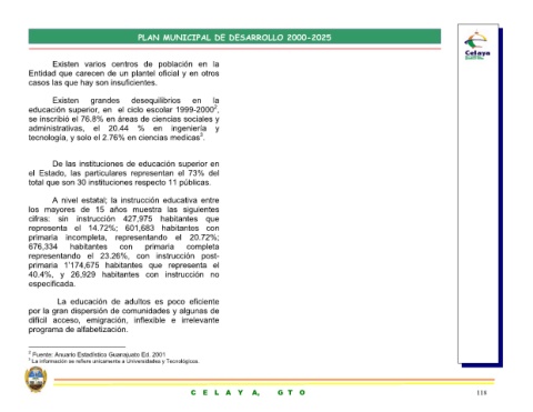 grandes educación superior, en el ciclo escolar 1999-2000 2 , se inscribió el 76.8% en áreas de ciencias sociales y administrativas, el 20.44 % en ingeniería y tecnología, y solo el 2.76% en ciencias medicas 3 . el Estado, las particulares representan el 73% del total que son 30 instituciones respecto 11 públicas. los mayores de 15 años muestra las siguientes cifras: sin instrucción 427,975 habitantes que con habitantes representando el 23
