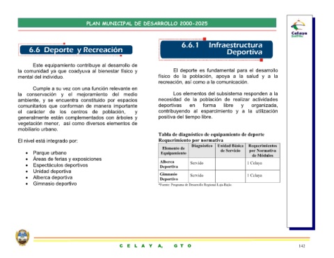 6.6 Deporte y Recreación Este equipamiento contribuye al desarrollo de la comunidad ya que coadyuva al bienestar físico y Cumple a su vez con una función relevante en la conservación y el mejoramiento del medio comunitarios que conforman de manera importante el carácter de los centros de población, y generalmente están complementados con árboles y vegetación menor, así como diversos elementos de