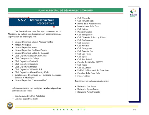 la población del municipio son: Municipio de Celaya para la recreación y esparcimiento de Unidad Deportiva Miguel Alemán Valdez Parque Xochipilli Unidad Deportiva Norte Unidad Deportiva Emiliano Zapata Unidad Deportiva Villas del Romeral Club Deportivo Raquet Club Cross Club Campestre de Celaya Club Deportivo Quetzalli Club Deportivo Excelaris Club Deportivo Britania Club Deportivo Villas del Sol Club Deportivo Álamo Country C
