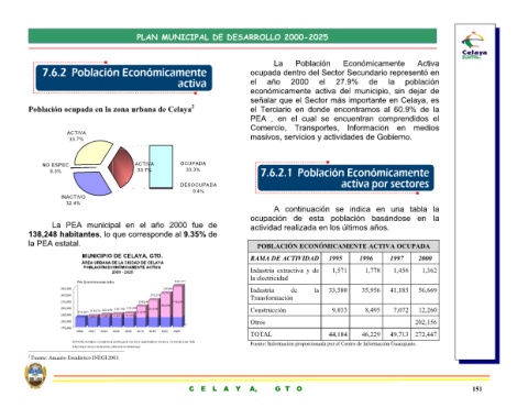 MUNICIPIO DE CELAYA, GTO. ÁREA URBANA DE LA CIUDAD DE CELAYA POBLACIÓN ECONÓMICAMENTE ACTIVA 2000 - 2025 234,300 226,198 222,252 14,733 11,631 7,685 212,421 212,421 212,421 2005 2003 2002 CÁLCULO: Grupo de Análisis y Planeación Municipal
