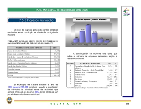 INGRESO EN SALARIOS MINIMOS Más de dos y menos de tres Salarios Mínimos Mas de cinco y hasta diez Salarios Mínimos Fuente: Anuario Estadístico Guanajuato, Edición 2001 El municipio de Celaya durante el año de 1997 generó 208,006 empleos siendo la prestación de servicios la principal rama de actividad que genera empleos, es decir el 40% de los empleos son por el desarrollo de esta actividad.