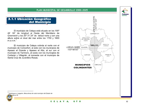 del Municipio 3.1.1 Ubicación Geográfica El municipio de Celaya está situado en los 100º 48´ 55” de longitud al Oeste del Meridiano de Greenwich y los 20º 31´24” de latitud norte y con una altura sobre el nivel del mar entre los 1750 y 1800 El municipio de Celaya colinda al norte con el municipio de Comonfort, al este con los municipios de Apaseo el Grande y Apaseo el Alto, al sur con el municipio de Tarimoro, al oeste con los municipios de Corta
