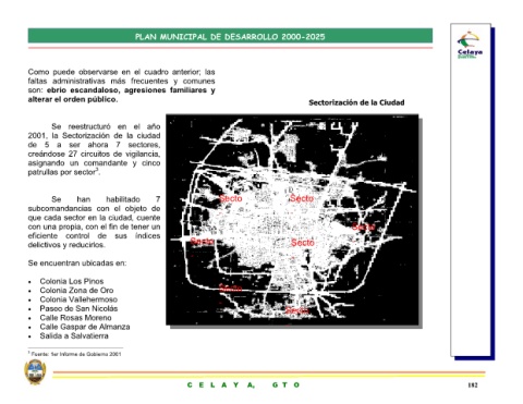 alterar el orden público. Se reestructuró en el año 2001, la Sectorización de la ciudad de 5 a ser ahora 7 sectores, creándose 27 circuitos de vigilancia, asignando un comandante y cinco patrullas por sector 3 . han Se subcomandancias con el objeto de que cada sector en la ciudad, cuente con una propia, con el fin de tener un eficiente control de sus índices delictivos y reducirlos. Se encuentran ubicadas en: Colonia Los Pinos Co