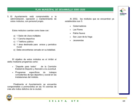 1 Salón de Usos múltiples 1 Cancha deportiva 1 Teléfono público Debe encontrarse cercado en su totalidad. El objetivo de estos módulos es el inhibir el delito mediante programas como: “Deporte para todos” de la Comisión Estatal de Deporte y Atención a la Juventud. específicos consistentes de tipo deportivo y social en las instalaciones del módulo. Finalmente el Ayuntamiento se encuentra comprometido a promoverlos en las 1