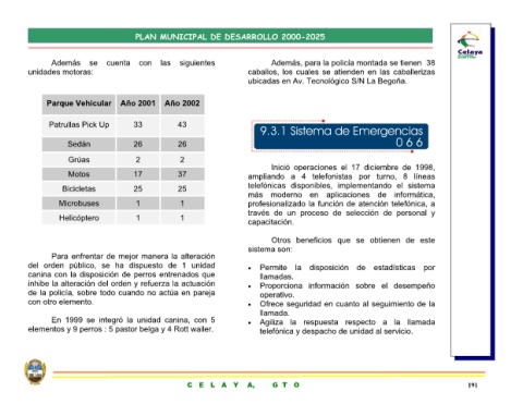 caballos, los cuales se atienden en las caballerizas ubicadas en Av. Tecnológico S/N La Begoña. 9.3.1 Sistema de Emergencias 9.2.2 Empresas de Seguridad ampliando a 4 telefonistas por turno, 8 líneas más moderno en aplicaciones de informática, profesionalizado la función de atención telefónica, a telefónica y despacho de unidad al servicio.