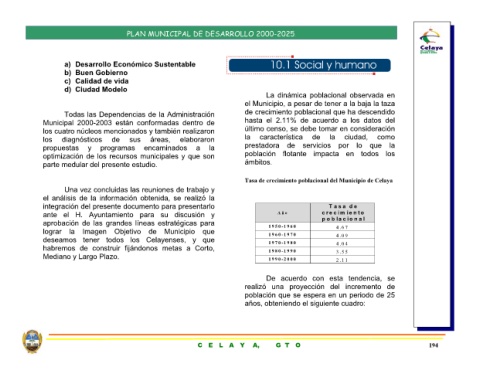 de último censo, se debe tomar en consideración prestadora de servicios por lo que la población flotante impacta en todos los Tasa de crecimiento poblacional del Municipio de Celaya realizó una proyección del incremento de población que se espera en un periodo de 25 años, obteniendo el siguiente cuadro: