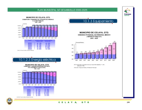 10.1.3 Equipamiento MUNICIPIO DE CELAYA, GTO. DEMANDA POTENCIAL DE PERSONAL MÉDICO ( SERVICIO PÚBLICO ) 2003 - 2025 701 642 588 567 176 557 548 117 63 42 32 525 525 525 525 525 2015 2010 2005 2003 2002 NOTA: Promedio de personal médico por cada 1000 habitantes = 1.39%