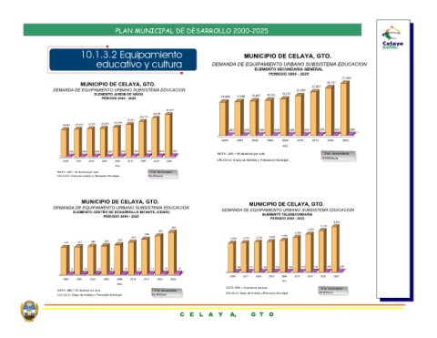 MUNICIPIO DE CELAYA, GTO. DEMANDA DE EQUIPAMIENTO URBANO SUBSISTEMA EDUCACION ELEMENTO SECUNDARIA GENERAL PERIODO 2000 - 2025 21,051 19,278 18,612 537 482 466 2010 2005 2003 Año MUNICIPIO DE CELAYA, GTO. DEMANDA DE EQUIPAMIENTO URBANO SUBSISTEMA EDUCACION ELEMENTO TELESECUNDARIA PERIODO 2000 - 2025 4,699 4,303 3,941 3,805 173 158 153 150 2015 2010 2005 2003 Año