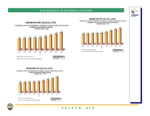 MUNICIPIO DE CELAYA, GTO. DEMANDA DE EQUIPAMIENTO URBANO SUBSISTEMA EDUCACION ELEMENTO SECUNDARIA TECNICA PERIODO 2000 - 2025 9,716 8,898 8,590 244 223 216 2010 2005 2003 Año MUNICIPIO DE CELAYA, GTO. DEMANDA DE EQUIPAMIENTO URBANO SUBSISTEMA EDUCACION ELEMENTO PREPARATORIA GENERAL PERIODO 2000 - 2025 5,299 4,789 4,386 4,234 121 110 107 2015 2010 2005 2003 Año
