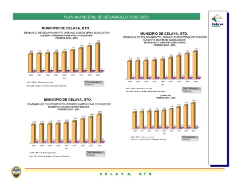 MUNICIPIO DE CELAYA, GTO. DEMANDA DE EQUIPAMIENTO URBANO SUBSISTEMA EDUCACION ELEMENTO PREPARATORIA POR COOPERACION PERIODO 2000 - 2025 371 340 328 10 9 9 2010 2005 2003 Año MUNICIPIO DE CELAYA, GTO. DEMANDA DE EQUIPAMIENTO URBANO SUBSISTEMA EDUCACION ELEMENTO COLEGIO DE BACHILLERES PERIODO 2000 - 2025 1,666 1,525 1,473 43 39 38 36 2010 2005 2003 Año