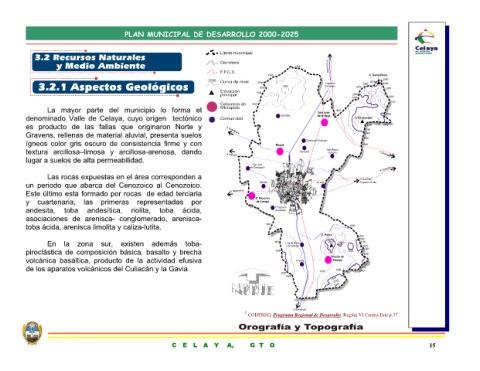 y Medio Ambiente 3.2 Recursos Naturales 3.2.1 Aspectos Geológicos La mayor parte del municipio lo forma el denominado Valle de Celaya, cuyo origen tectónico es producto de las fallas que originaron Norte y Gravens, rellenas de material aluvial, presenta suelos ígneos color gris oscuro de consistencia firme y con lugar a suelos de alta permeabilidad. Las rocas expuestas en el área corresponden a un periodo que abarca del Cenozoico al Cenozoico. Este