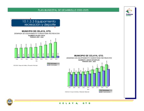recreación y deporte 10.1.3.3 Equipamiento MUNICIPIO DE CELAYA, GTO. DEMANDA DE EQUIPAMIENTO SUBSISTEMA RECREACION ELEMENTO PLAZA CIVICA PERIODO 2000 - 2025 505,198 462,651 423,688 409,037 80,832 74,024 67,790 65,446 2015 2010 2005 2003 Año