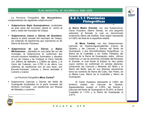 La Provincia Fisiográfica comprendiendo las siguientes subprovincias 3 : Subprovincia Bajío Guanajuatense, localizadas en gran parte del municipio; este y oeste del municipio de Celaya. Subprovincia Llanos y Sierras de Querétaro, Sierra de Escudo-Volcanes. Las de Subprovincia Lomerío y Llanos. La Provincia Fisiográfica Mesa Central 4 : Subprovincia Llanuras y Sierras del Norte de de Mesetas y Lomeríos.