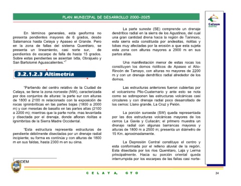 En términos generales, esta geoforma no presenta pendientes mayores de 6 grados, desde Salamanca hasta Celaya y Apaseo el Grande. Pero en la zona de fallas del sistema Querétaro, se pendientes de escarpe de falla de hasta 15 grados. Sobre estas pendientes se asientan Ixtla, Obrajuelo y “Partiendo del centro relativo de la Ciudad de Celaya, se tiene la zona noroeste (NW), caracterizada por dos conjuntos de alturas: la parte sur con alturas de 1800 a 2