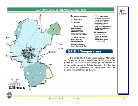 de Celaya es de un promedio de 19.3 o C, donde las partes más calientes se encuentran principalmente en el este de la ciudad de Celaya (más de 19.3 o C) y las más bajas se presentan en las elevaciones del