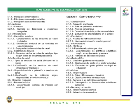 6.1.- Analfabetismo 6.2.- Escolaridad 6.3.- Infraestructura 6.3.1.- Planteles 6.3.1.2.- Caracterización 6.4.- Gasto público 6.5.- Cultura 6.5.1.- Infraestructura 6.6.- Deporte y recreación